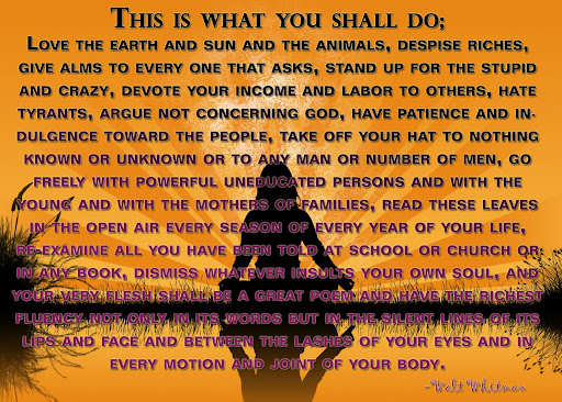 This is what you shall do: Love the earth and sun and the animals, despise riches, give. Love the earth and sun and the animals, despise riches, give alms to every one that asks, stand up for the stupid and crazy, devote your income and labor to others,.